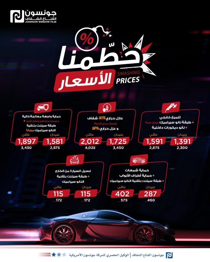 الخدمة ---تلميع خارجي + طبقة نانو سيراميك + نانو ديكورات داخليةعازل حراري IR70 شفاف و عازل حراري %50حماية واجهة معالجة ذاتية + طبقة سيلنت بتقنية النانو سيراميكحماية شمعات + حماية أطراف الأبواب + طبقة سيلنت بتقنية النانو سيراميكغسيل السيارة من الخارج + طبقة سيلنت بتقنية النانو سيراميك